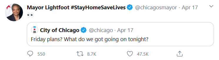 “Stay home, save lives.” Politics aside, we can all appreciate a timely and effective marketing campaign. If you’ve spent any time on social media in the past few weeks (as many of us have), you’ve likely gotten wind of Chicago Mayor Lori Lightfoot’s efforts to encourage and educate her constituents on the importance of staying home to stop the spread of the coronavirus. If not, you’ve definitely seen a few memes circulating along with her #StayHomeSaveLives hashtag, or from fans all across the internet, including on Instagram under @WheresLightfoot, an account created by Chicago’s own Danny Martinez that racked up almost 30,000 followers in a matter of days. Here are a few of our favorites from – where else? – Lightfoot’s Twitter.