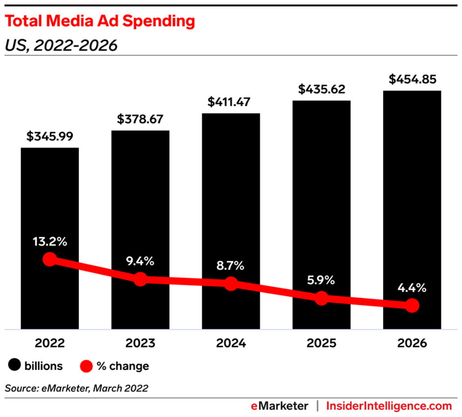 Despite all the doom and gloom, eMarketer and Insider Intelligence still forecast solid growth in total media ad spending for this year and continued growth thereafter. “Despite the sour economic vibe, we still expect total media ad spending to stick close to its current growth trajectory of 13.2% year over year.” Those growth projections slow in the four years to follow, but they still project growth.
